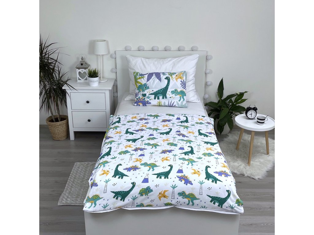 Ágynemű 100x135 és 40x60 cm méretű, különböző dinoszauruszokkal a huzaton. Táblázatok a fehér és zöldes árnyalatok nem zavarják a morzsákat a túlzott színválasztékkal. Kényelmes lesz a kiváló minőségű 100% pamutnak köszönhetően, amely évek óta népszerű a puha és légáteresztő miatt. A cipzáros zárás a lehető legjobban felgyorsítja a kiságy cseréjét.
