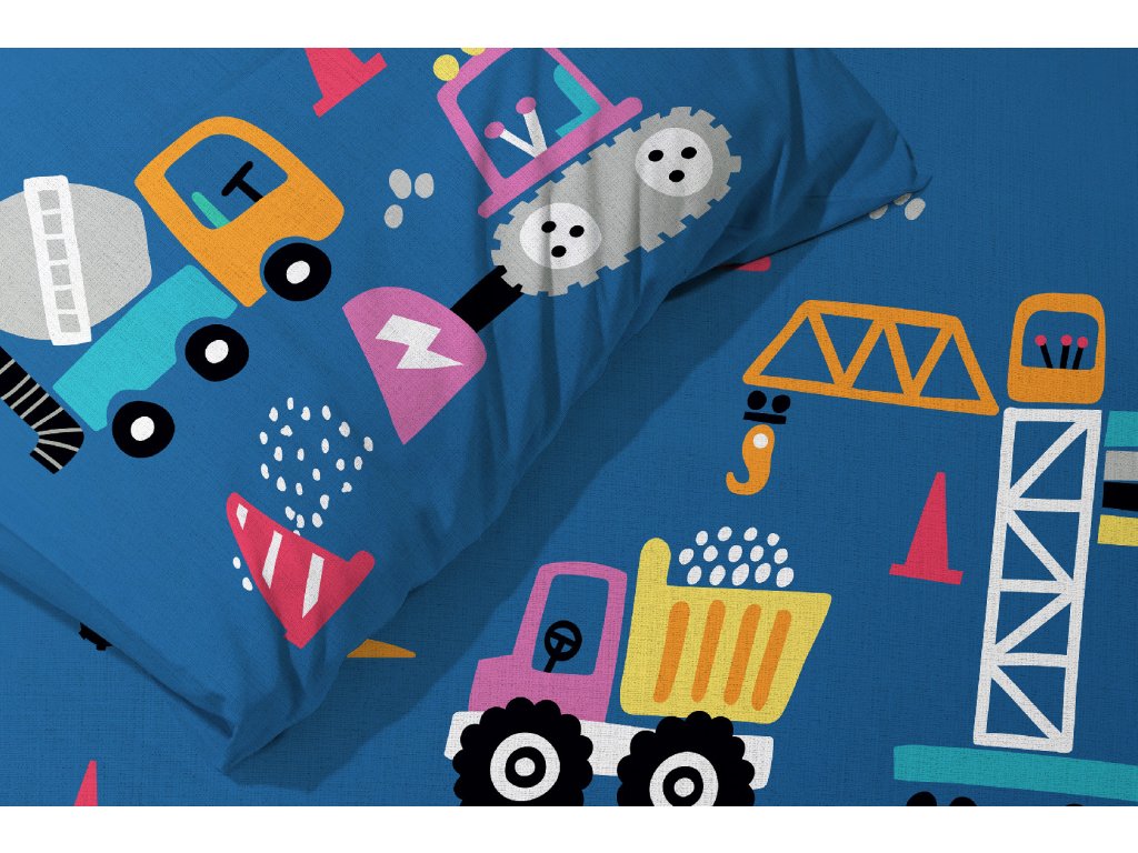 A vidám nyomat mindkét oldalon eltérő – a sötétkék előlapon kotrógépek, keverők, daru és egyéb autók találhatók az építkezésen. A hátoldalon, ami más színű, az építkezéstől eltérő közlekedési eszközök is vannak.