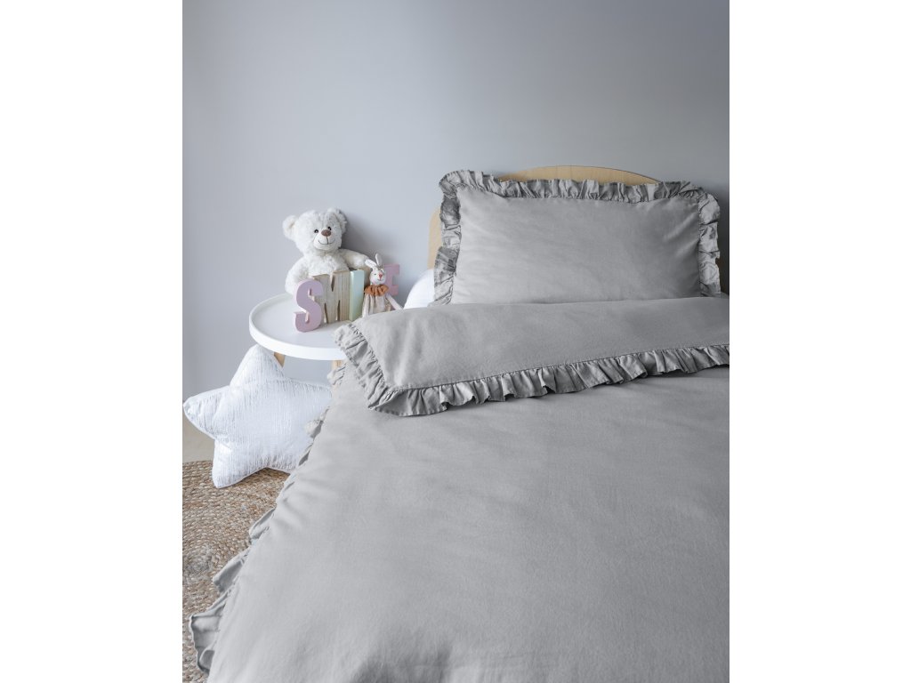 Kiágy ágyneműk stílusos világosszürke színű fodrokkal egy csipetnyi eleganciát kölcsönöznek a kiságynak.