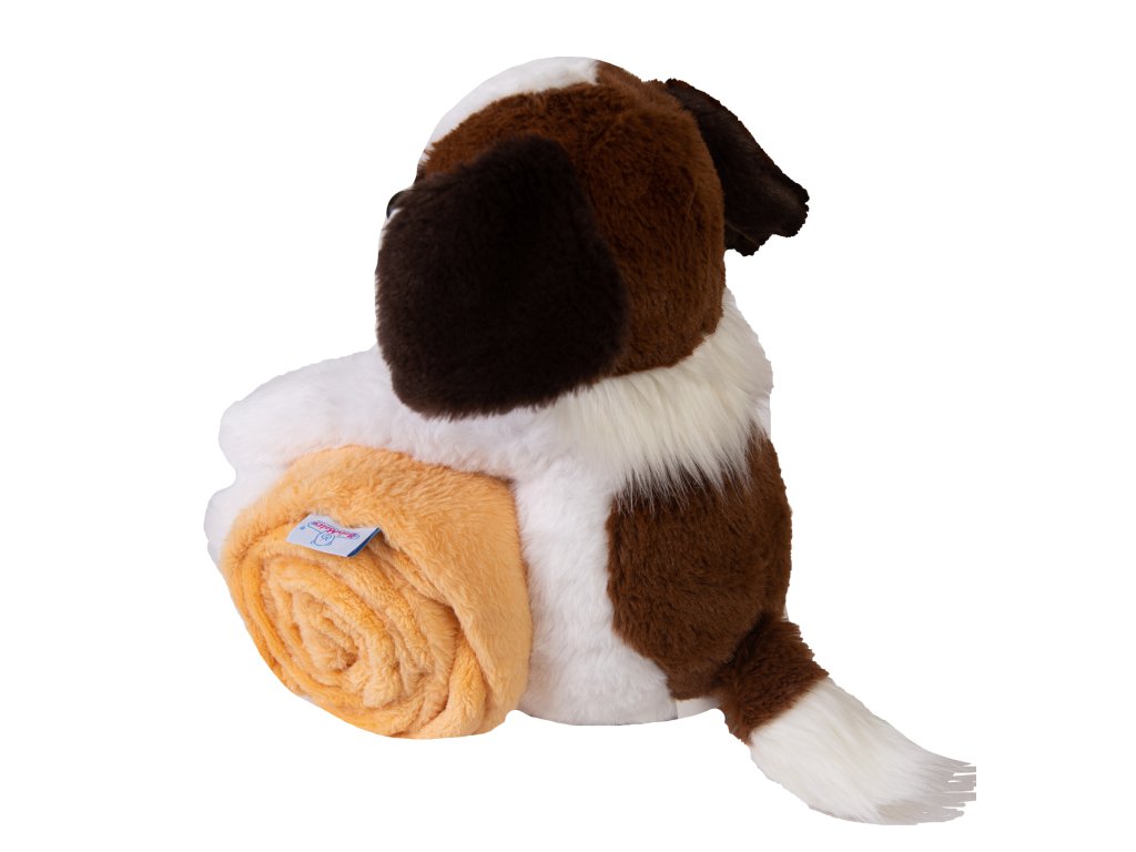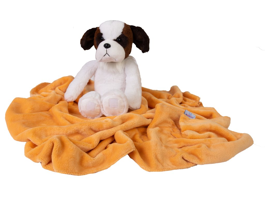 Egy puha narancssárga plüss takaró 85x100 cm méretben melegít és simogat. A takaró egyesíti a takaró és a plüss kutya előnyeit. A takaró feltekerése után helyezze a plüsskutya mancsába, és rögzítse egyszáraz cipzárral
