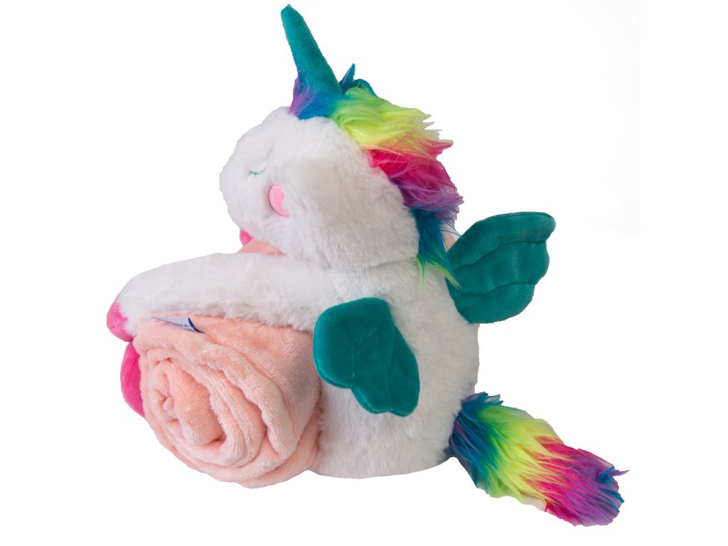 Egy puha rózsaszín plüss takaró 85x100 cm méretben melegít és simogat. A takaró egyesíti a takaró és a kitömött Unikornis előnyeit. A takaró feltekerése után helyezze a kitömött egyszarvút a mancsába, és rögzítse száraz cipzárral.