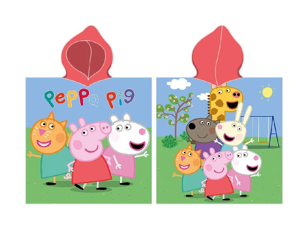 Poncsó A Peppa Pig kiváló minőségű 100% pamutból készült, amely kiváló nedvszívó képességet és egyben puhaságot garantál a gyermekek bőrével szemben. A poncsó 55x110 cm méretű, és klasszikus törölközőként használható, amibe fürdés után, vagy például nyáron a strandon a nap elleni védelemként tekerheti a gyereket. Ideális 2 és 6 éves kor közötti gyermekek számára.