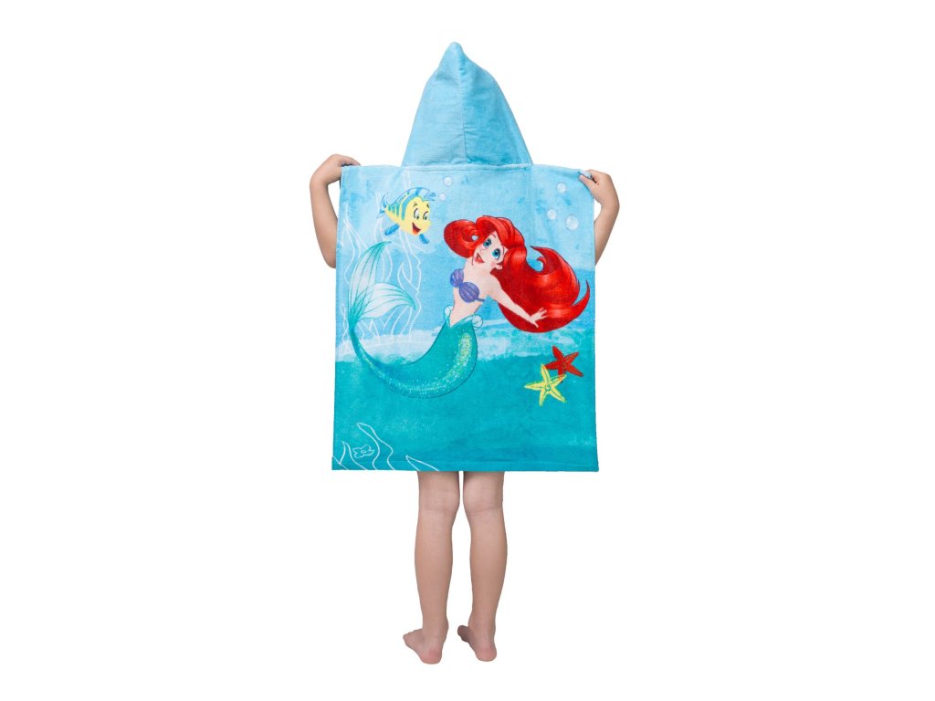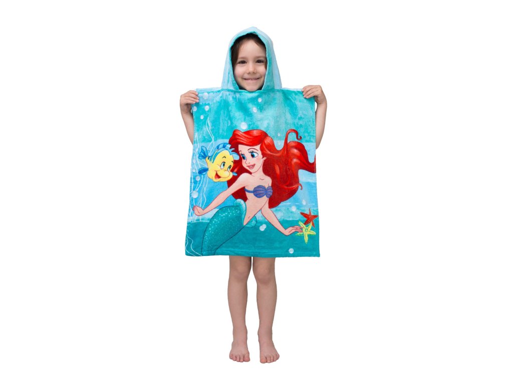 APoncho Arielka kiváló minőségű 100% pamutból készült, amely kiváló nedvszívó képességet és egyben puhaságot garantál a gyermekek bőrével szemben. A poncsó 50x115 cm méretű, klasszikus törölközőként használható, amibe fürdés után, vagy például nyáron a strandon, napvédelemként tekerheti a gyereket. Ideális gyerekeknek 3-6 éves korig. Egy mesebeli poncsó minden kis hercegnőnek. A poncsó elülső részén Ariel hercegnő a barátjával. A poncsó eleje finomra vágott frottírból, velúrból készült, sima felülete nagyon kellemes tapintású. A nagyon jó nedvszívó képességről a sűrű szövésű frottír hurok gondoskodik, amely a poncsó hátoldalát képezi.