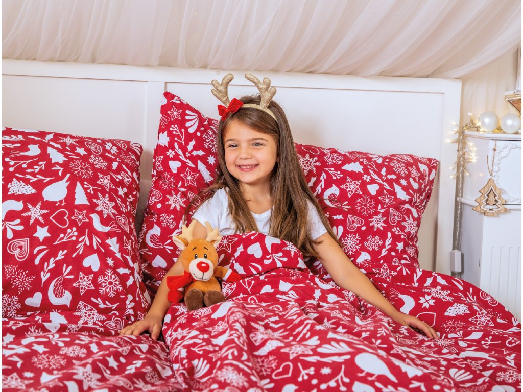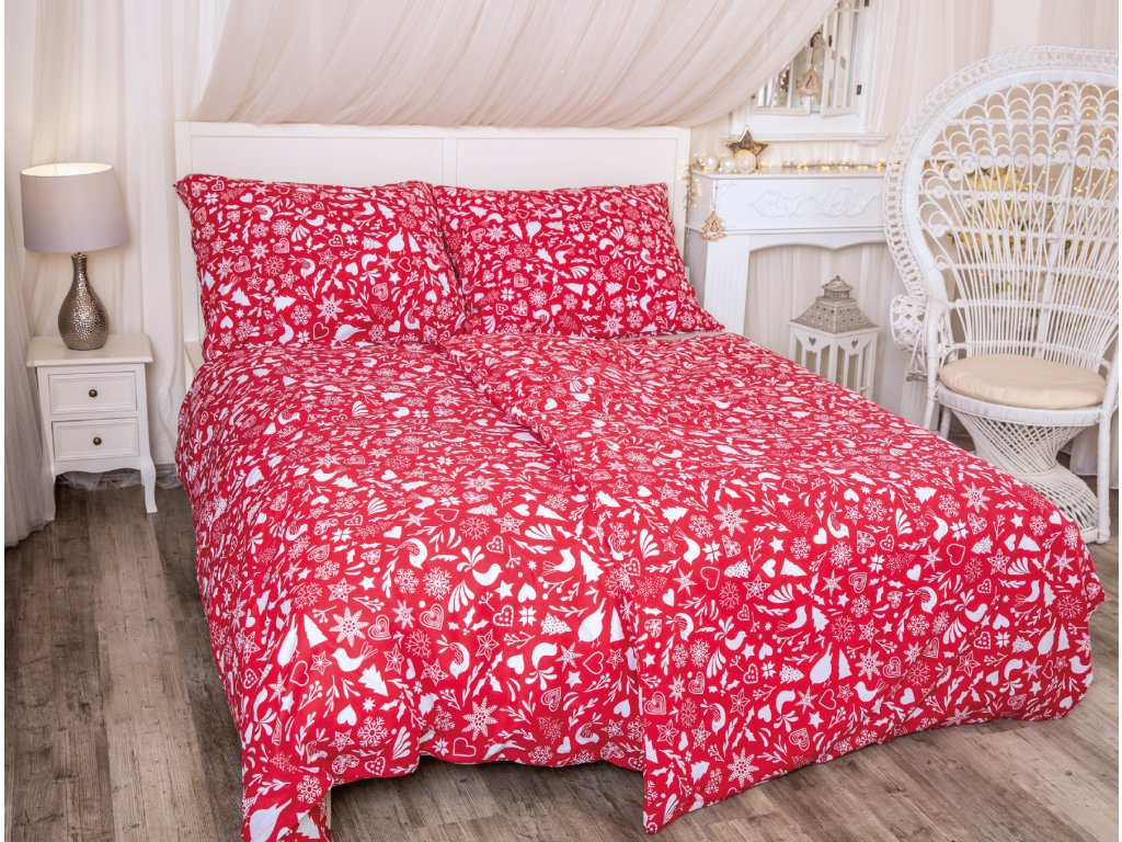 Ahosszú téli esték a varázslatos karácsony téli témájú ágyneműjéhez tartoznak. Egy piros színű, fehér karácsonyi motívumokkal megszórt ágyneműhuzatot hozunk hálószobájába. Karácsonyfa és csillagok, különféle formájú szívek, gallyak, madarak és hópelyhek, mindezt megtalálja ezen az ágyneműn.