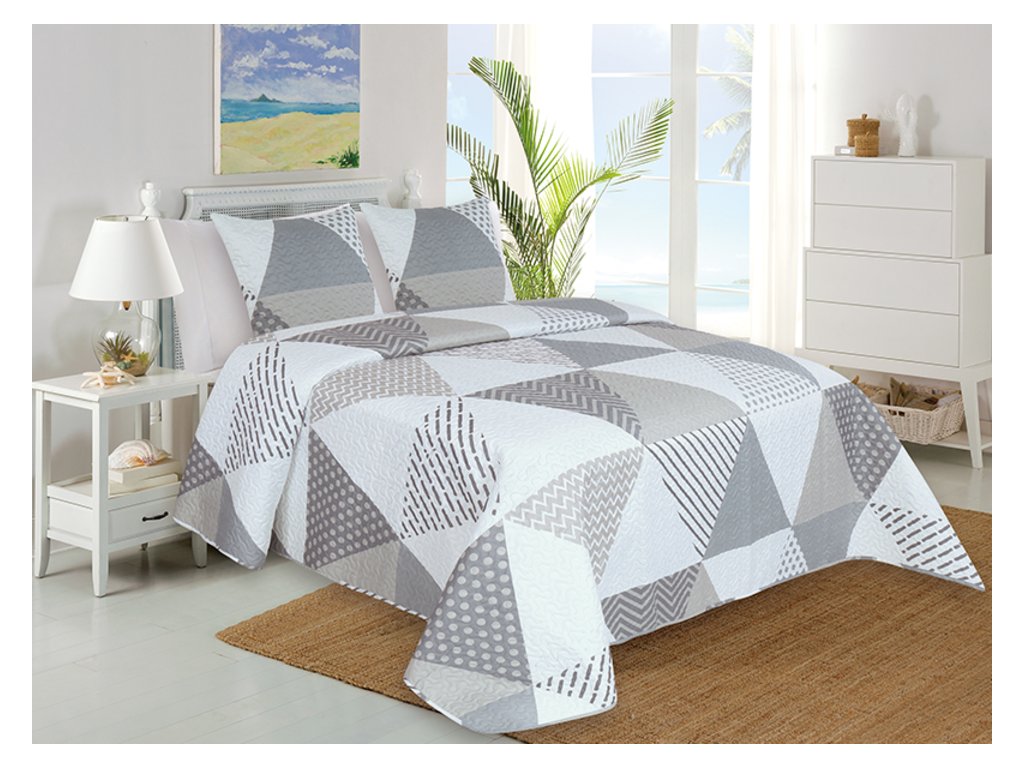 A steppelt ágytakaró modern mintával eláll a lélegzete. Az ágytakaró fehér, szürke és bézs színekben harmonizál. A különböző színű nagy háromszögek gyönyörű geometrikus mintát alkotnak. Ágyhuzat, amely 100% poliészterből készült, mérete 220x240 cm tökéletesen illeszkedik egy franciaágy fölé. Az ágytakarót enyhén töltik és varrják. Jellegzetes stílust és hangulatos harmóniát kölcsönöz hálószobájának. Válassza ki kínálatunkból a hálószobájába pontosan megfelelő színű takarót. A takarót kiegészítheti ágyneművel azonos vagy hasonló kivitelben, és a hangolt készletnek köszönhetően egységes és egyedi megjelenést kölcsönöz hálószobájának. A takaró könnyen karbantartható, alkalmanként mosógépben 30°C-on javasoljuk a mosást.