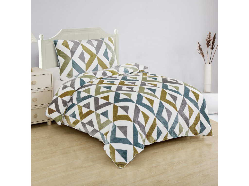 Színes geometrikus formák motívumával ellátott ágyneműk, melyek kétoldalasak.. A készlet egy paplanhuzatot és egy párnát tartalmaz ugyanabban a motívumban.