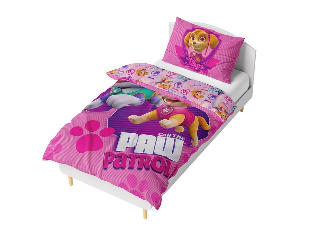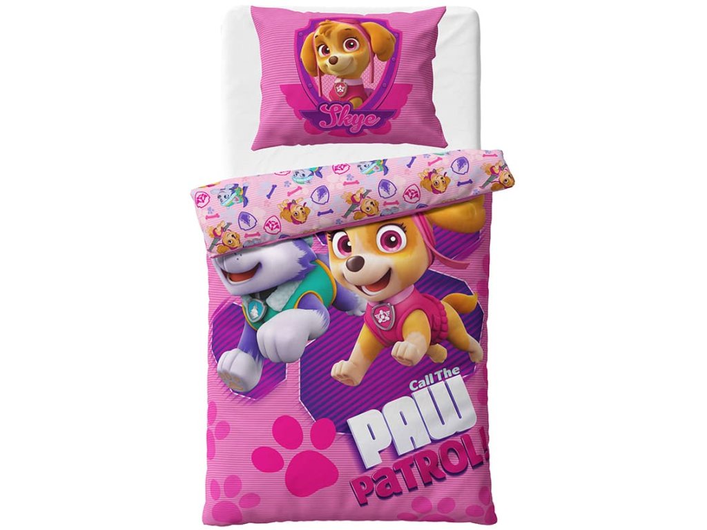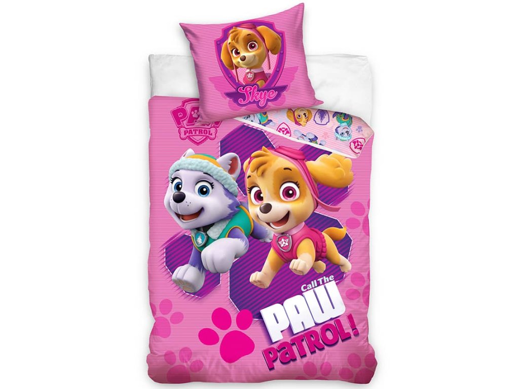 A lapok arcán rózsaszín háttér látható sötétebb rózsaszín mancsokkal, középen pedig két bátor mentőlány, Skye és Everest, egy nagy lila mancs mellett, amelyen a Call the Paw Patrol felirat látható! alsó részén. A hátoldal mély rózsaszín, Skye és Everest karakterekkel díszítve, és sötét rózsaszín Paw Patrol szimbólumokkal van kiegészítve, míg a párnahuzat mindkét oldalán Skye pilóta látható.