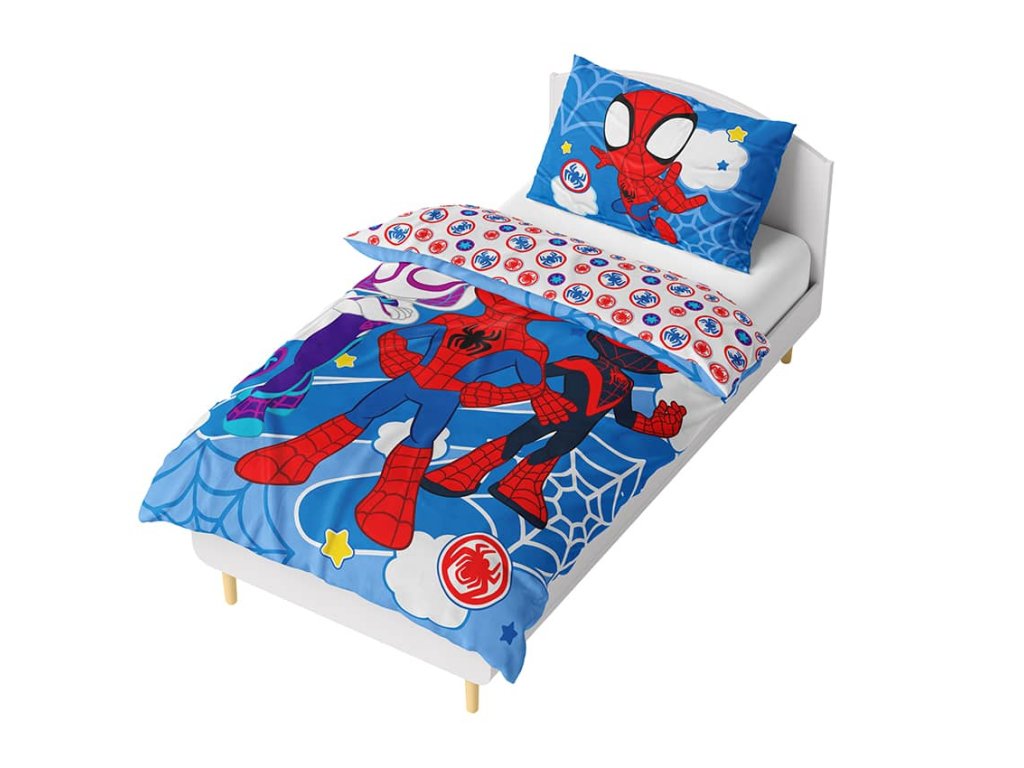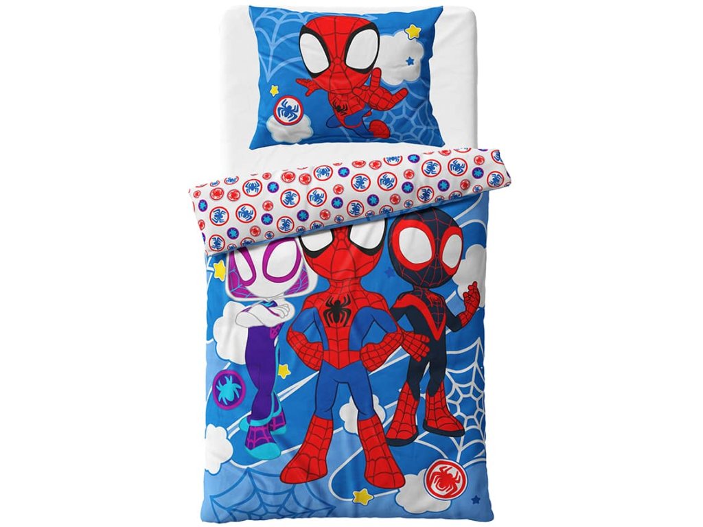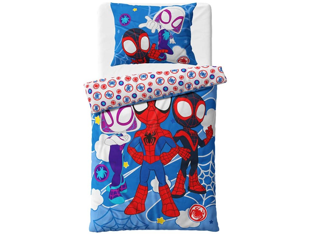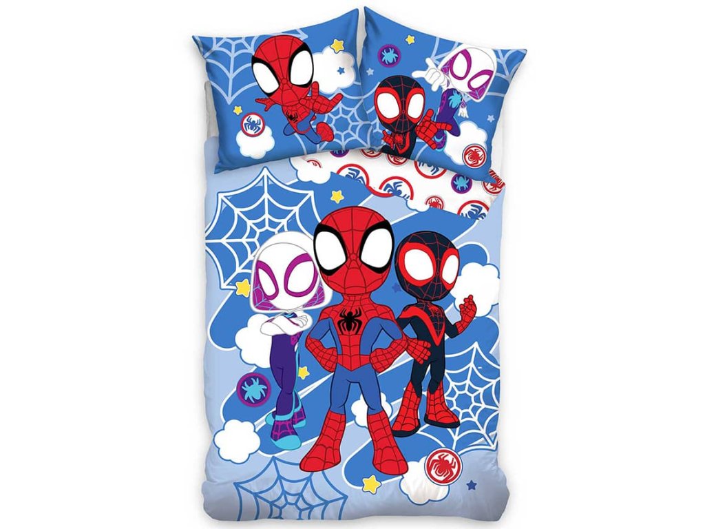 A lap elején a merész hősök, Spidey, Ghost Spider és Spin állnak, akik a hétköznapi világban Peter Parker, Gwen Stacy és Miles Morales szerepében tűnnek fel. Veszély esetén felveszik a pókruhájukat, és mindig megmentik a helyzetet, míg a takaró hátoldalán mindegyikük pókjelvénye látható; a párnahuzat kétoldalas, egyik oldalán Pók, a másikon Szellempók és Spina képe látható.