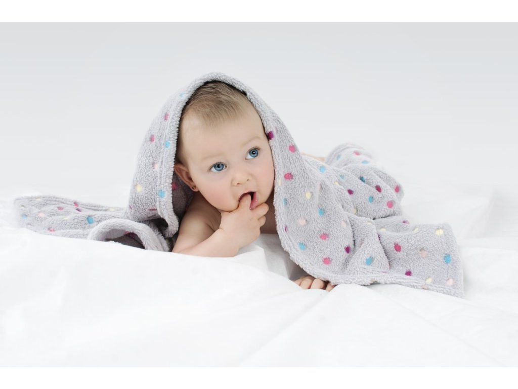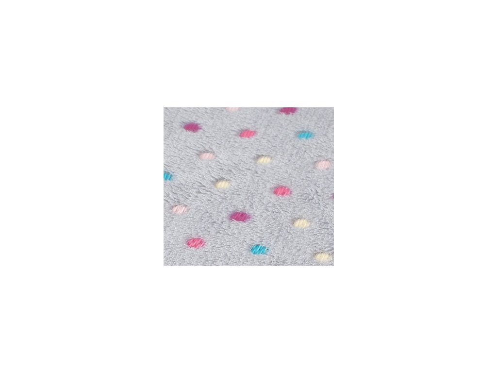 Egy puha szürke plüss takaró színes pöttyökkel 75x100 cm méretben melegít és simogat. Alkalmas babakocsiba vagy csak a baba takarására. Ennek az anyagnak a puhasága meleg és sűrű halmozódást okoz a felhasznált anyagból.
