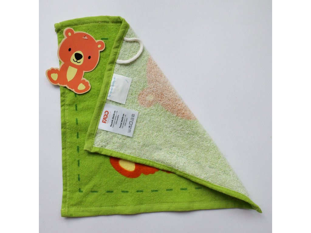Gyermek frottír törölköző A Medve anyaga 100% pamut. Az elülső oldal finomra vágott frottírból készült, velúr, nagyon kellemes tapintású. A törülköző hátoldala sűrű szövésű frottír hurokból készült, amely garantálja a jó nedvszívó képességet.