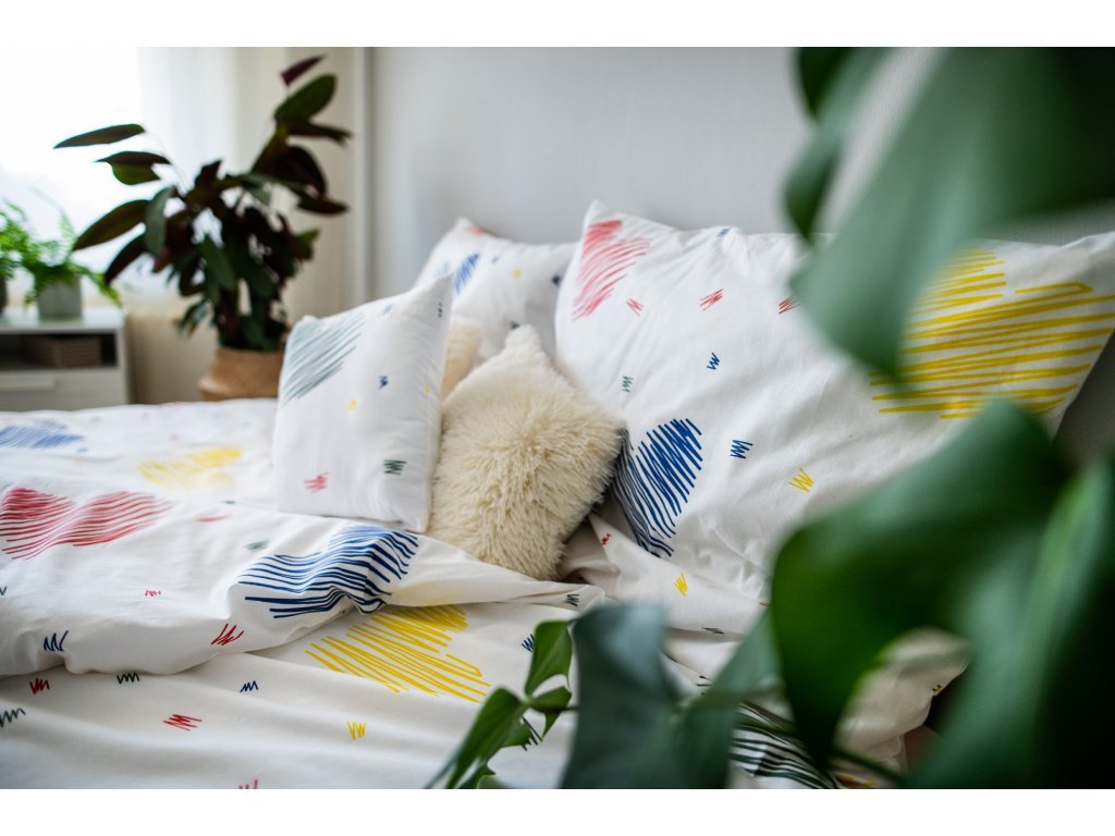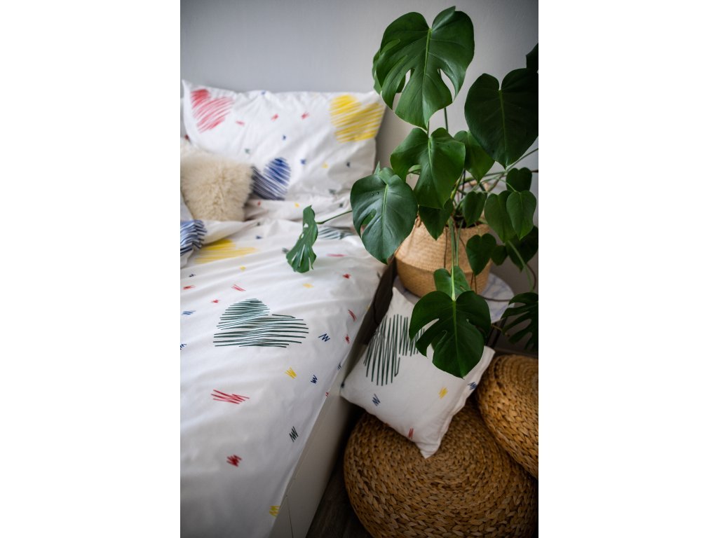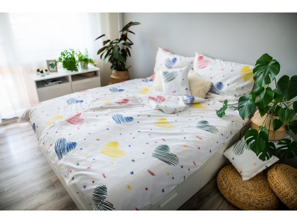 Fehér lapok piros, kék, sárga és zöld szívecskékkel. Ez a minta megjelenik a 70x90 cm-es párnahuzatokon és a párnán is. A minőségi pamut nagyon puha és kellemes tapintású. A lepedők normál méretben 140x200 és 70x90 cm. Ezen kívül párnahuzatot is kínálunk 40x40 cm-es méretben. Ehhez a lepedőhöz a tölteléket is megtalálja e-shopunkban. A cipzáros zárásnak köszönhetően könnyebb lesz az ágynemű.