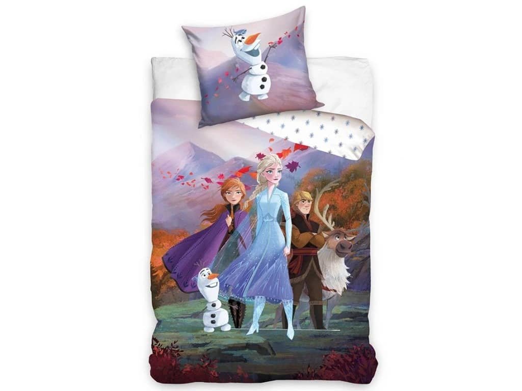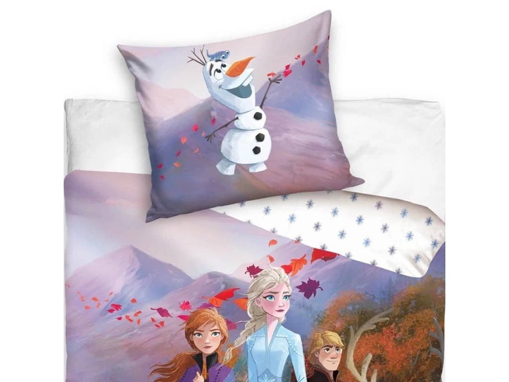 Az Oscar-díjas Frozen című film ihlette Elsát, amint kalandra indul húgával, Annával és Olaffal, hogy megmentse Arendelle-t és az elvarázsolt erdőt. A paplanhuzat hátoldala fehér, kék és szürke hópehelyszerű csillagokkal, a párnahuzaton pedig Olaf és egy kis szalamandra látható, akiket varázslatos szellő visz.