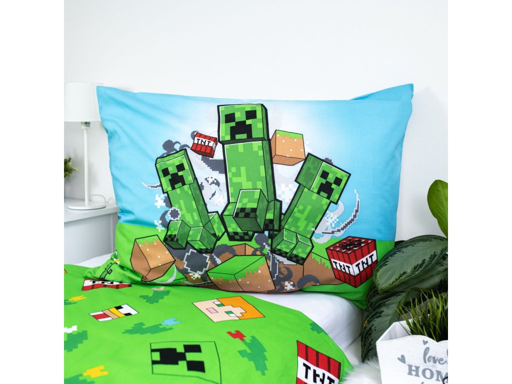 Lapok a Minecraft játékok rajongóinak. A játék karakterei a kék takaró elején láthatók. A takaró hátoldala zöld. A 100% pamut jól felszívja a nedvességet és gyönyörűen melegít. A cipzáros rögzítés megkönnyíti az öltözködést. A készlet egy 70x90 cm-es párnahuzatot és egy 140x200 cm-es paplanhuzatot tartalmaz. A lapok kétoldalasak.