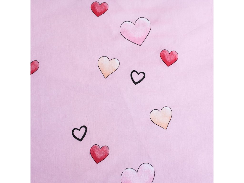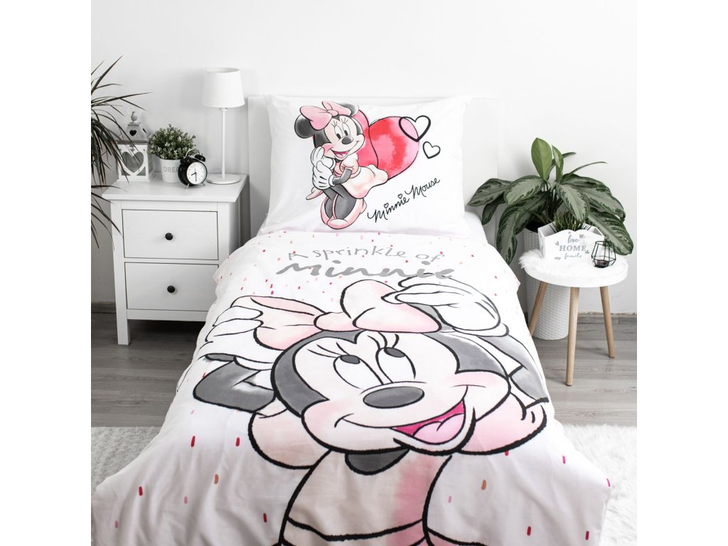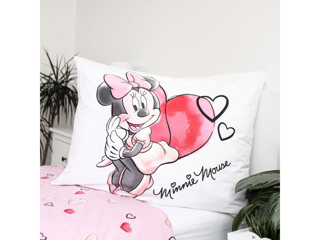 Az ágyneműk mindkét oldalára nyomtatottak – mindegyik oldalon más-más motívum található, aminek köszönhetően könnyedén megváltoztathatja az ágy kinézetét hangulatának megfelelően. Az elülső lapokon Minnie igazgatja az íját. A hátlap rózsaszín, kis szívek motívumával.