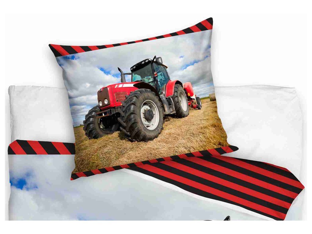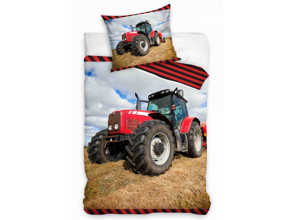 A nehézgépek szerelmesei számára varrott lepedők vártak egy piros traktorral. A gyermekágyneműk 100%-ban sima erősítésű pamutból készülnek és kétoldalasak. A paplanhuzat elején egy hatalmas piros traktor képe látható, amely előkészíti a talajt a tavaszi szezonra. A takaró teteje és alja is piros és fekete csíkokkal van bélelve, amelyek figyelmeztető szalagra emlékeztetnek. A paplanhuzat hátulja piros és fekete csíkokkal csíkozott, amelyek figyelmeztető szalagra emlékeztetnek.