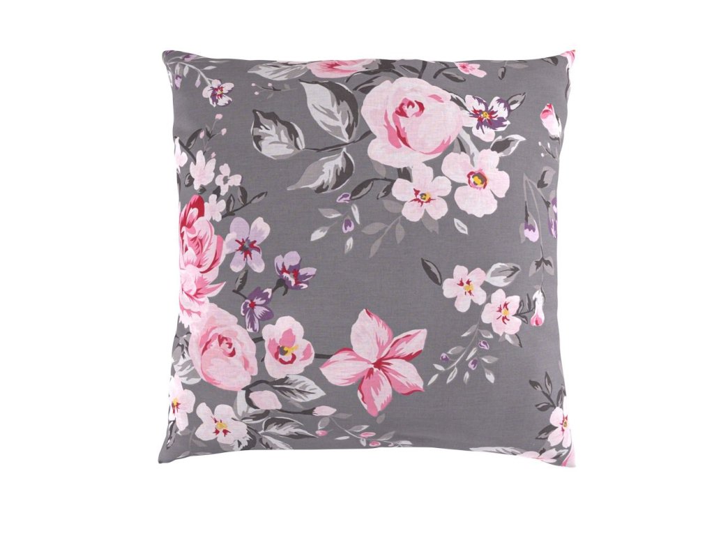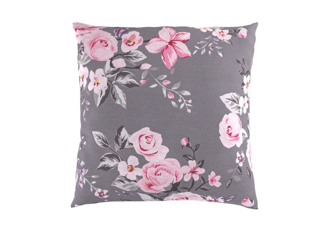 A szürke pamutból készült Beatrice párnahuzatot szürke alapon rózsaszín virágok díszítik.