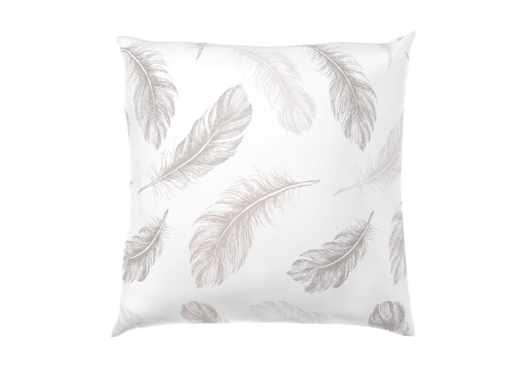 A Shelby pamut párnahuzat - fehér, fehér alapon sötét és világos bézs színű tollak díszítik.