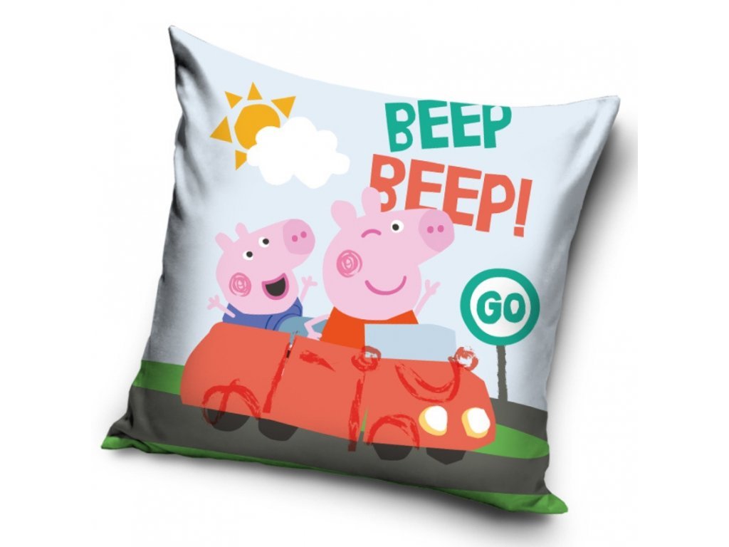 Díszhuzat gyerekeknek Pepin malac nyomattal ellátott párnához. A vidám borítón Pepinka és Tomík látható, akik piros autóval indulnak kirándulni.