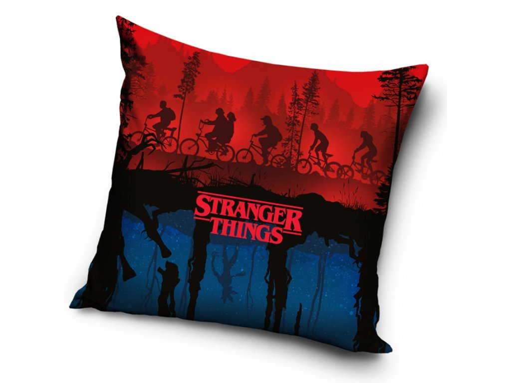 Dekoratív párnahuzat Stranger Things nyomattal. A postás lapon a való világot látjuk, ami összefonódik a párhuzamos világgal. A piros felsőben a sorozat hősei bicikliznek, a kék alsóban pedig egy párhuzamos világot kapunk „fejjel lefelé”. Soha nem tudhatod, mikor és hol jelenik meg a Demogorgon, amely egy párhuzamos világban rejtőzik.