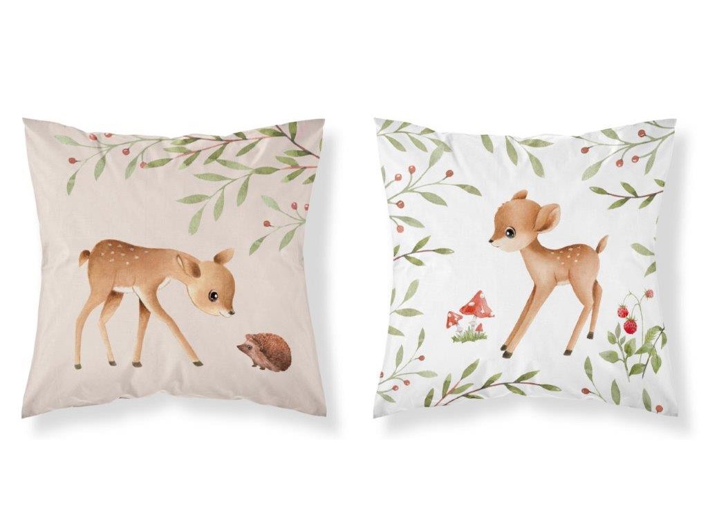 A gyermekeknek szánt dekoratív párnahuzat őzbarna és sündisznó motívummal gyönyörű és praktikus kiegészítője minden kiságynak.