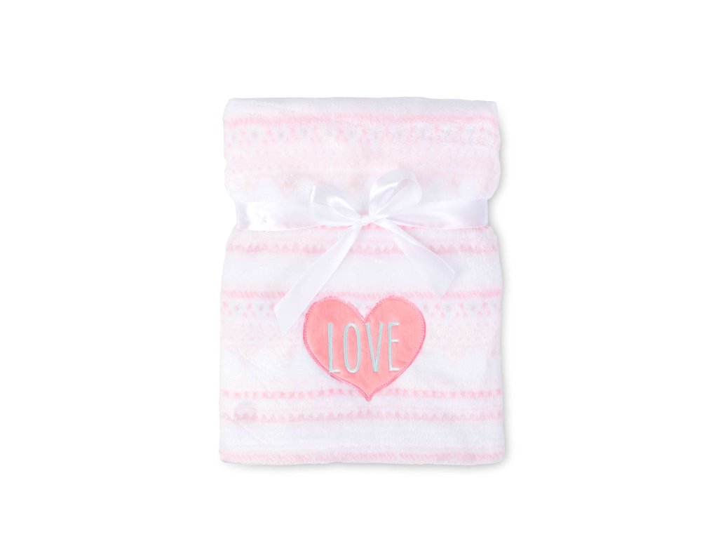 Egy puha rózsaszín-fehér takaró hímzett rátéttel 75x100 cm méretben melegít és simogat. Alkalmas babakocsiba vagy csak a baba takarására. Ennek az anyagnak a puhasága meleg és sűrű halmozódást okoz a felhasznált anyagból.