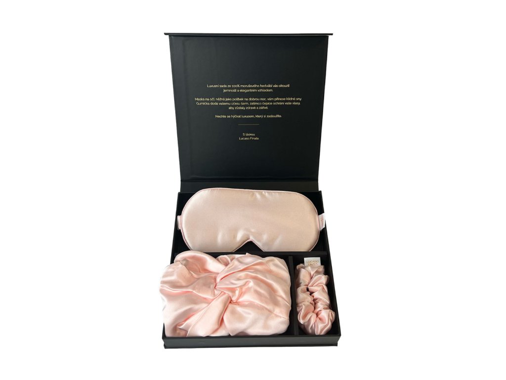 Prémium selyem ajándékkészlet Rose Pink árnyalatban hálósapkával, alvómaszkkal és gumival a Lucaso Finata luxusmárkától.