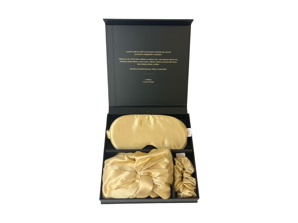 Prémium selyem ajándékkészlet Royal Gold árnyalatban hálósapkával, alvómaszkkal és gumival a Lucaso Finata luxusmárkától.
