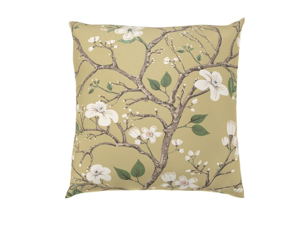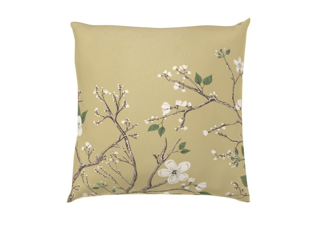 A Spring Gold pamut párnahuzatot virágzó gallyakból álló mintázat díszíti, sárga-arany háttéren.