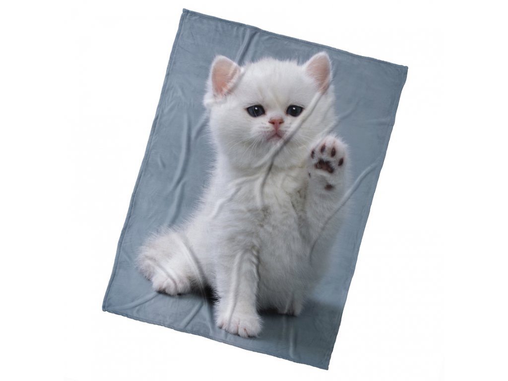Atakaró mindenkit boldoggá tesz, aki szereti az aranyos cicákat. A kék takarón egy kicsi, fehér cica feszíti felénk az első mancsát. Mindenképpen meg akarja ragadni azt a finomságot, amit gazdája a kezében tart, ezért óvatosan koncentrál. Ez a takaró mindenekelőtt a puha és sima anyaga miatt fog örömet okozni, amibe abszolút mindenki szeretne belebújni. A méret 150x200 cm lehetővé teszi a gyerekeknek, hogy gyönyörűen bebugyolálják magukat a takaróba és élvezzék annak puhaságát. A takaró anyaga polár korall, 100% poliészter. A takaró könnyen karbantartható,nem gyűrődik és gyorsan szárad. Használható könnyű takaróként vagy piknikre.