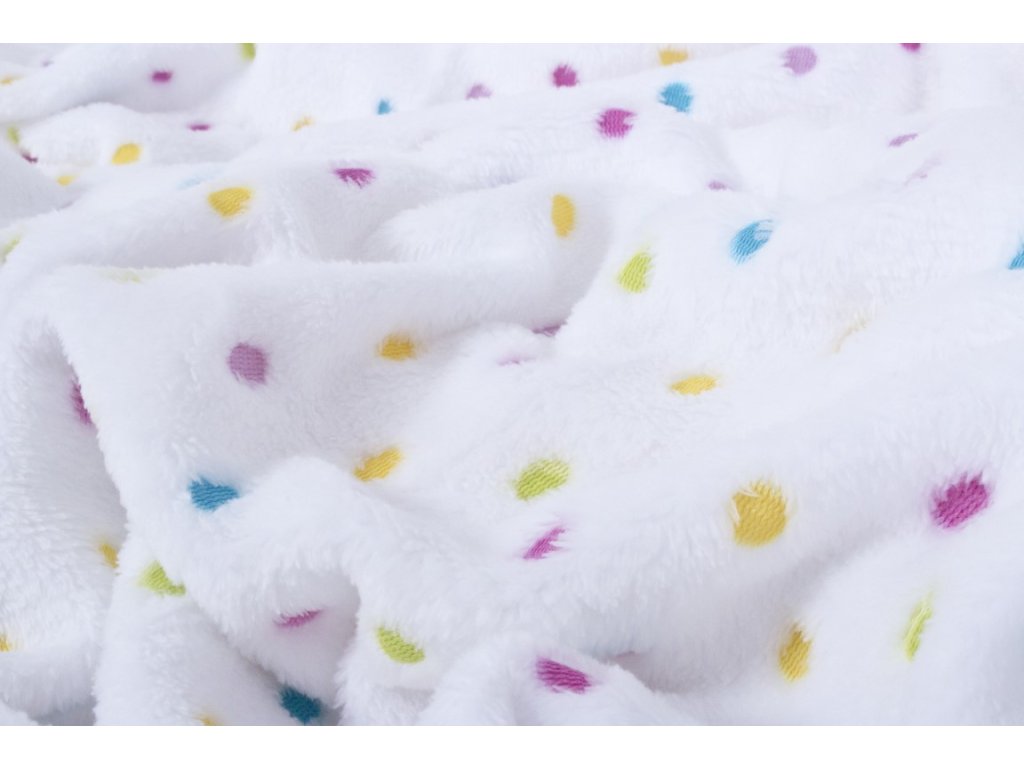Egy puha fehér plüss takaró színes pöttyökkel 75x100 cm méretben melegít és simogat. Alkalmas babakocsiba vagy csak a baba takarására. Ennek az anyagnak a puhasága meleg és sűrű halmozódást okoz a felhasznált szöveten.