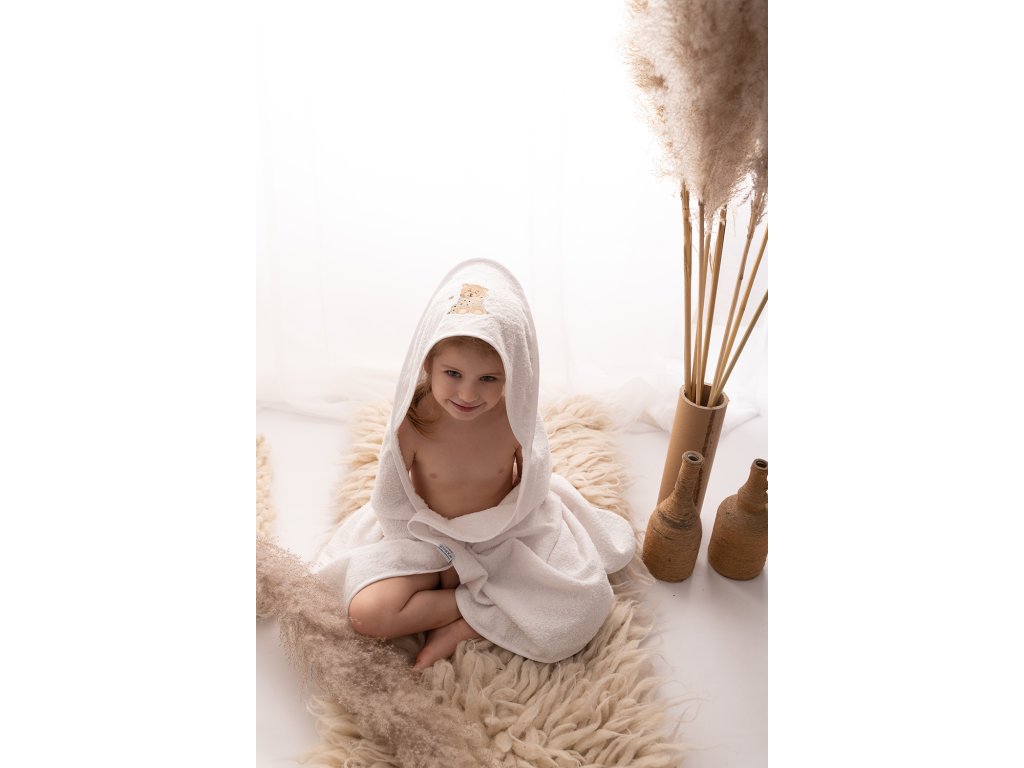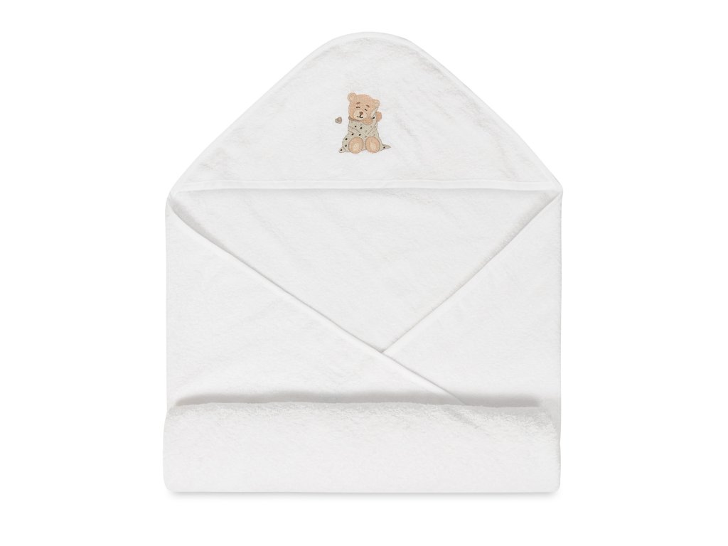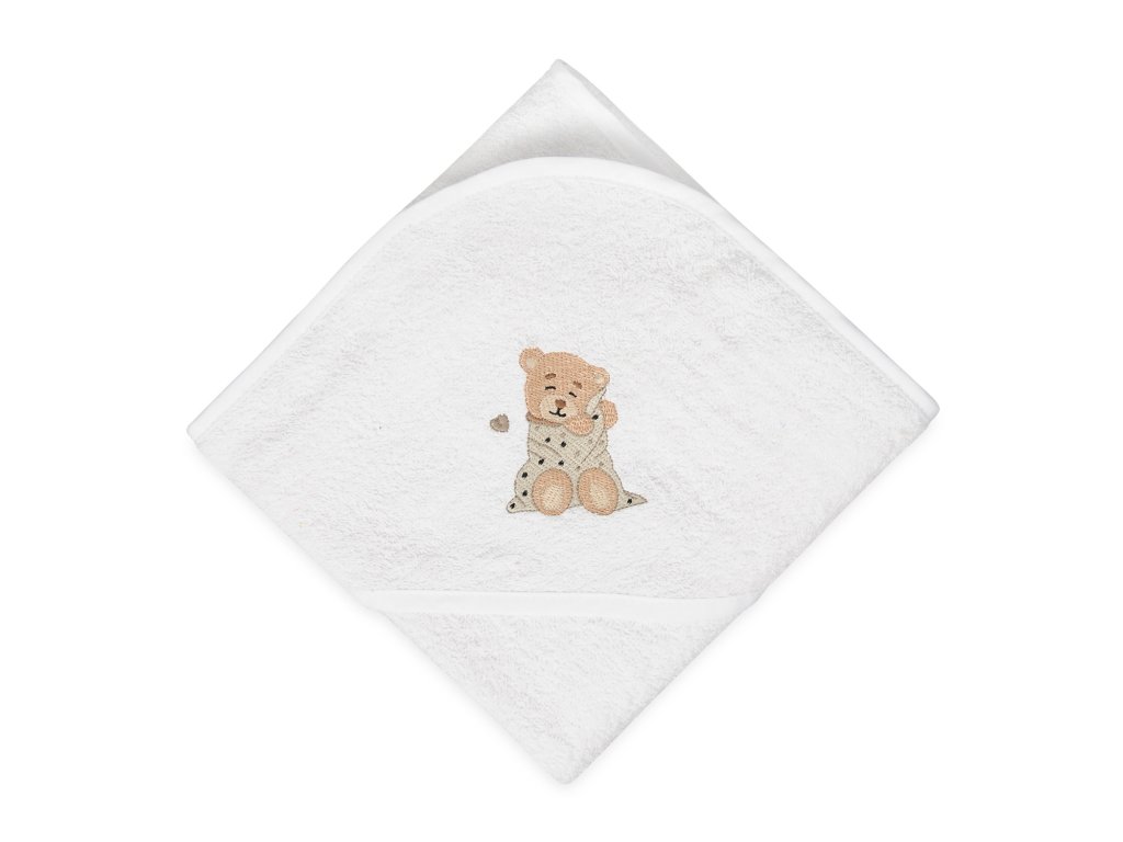 Ez a törölköző puha frottírból készült, amely nagyon kellemes tapintású. A törölköző alkalmas a baba érzékeny bőrére, nagyonjól beszívódik, alaposan kiszárítja a babát, a kapucni pedig védi a baba nedves fejét a megfázástól. Egy kis mackó gyönyörű hímzésével díszítve.