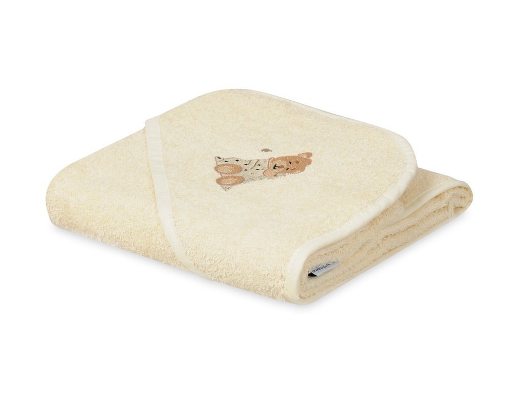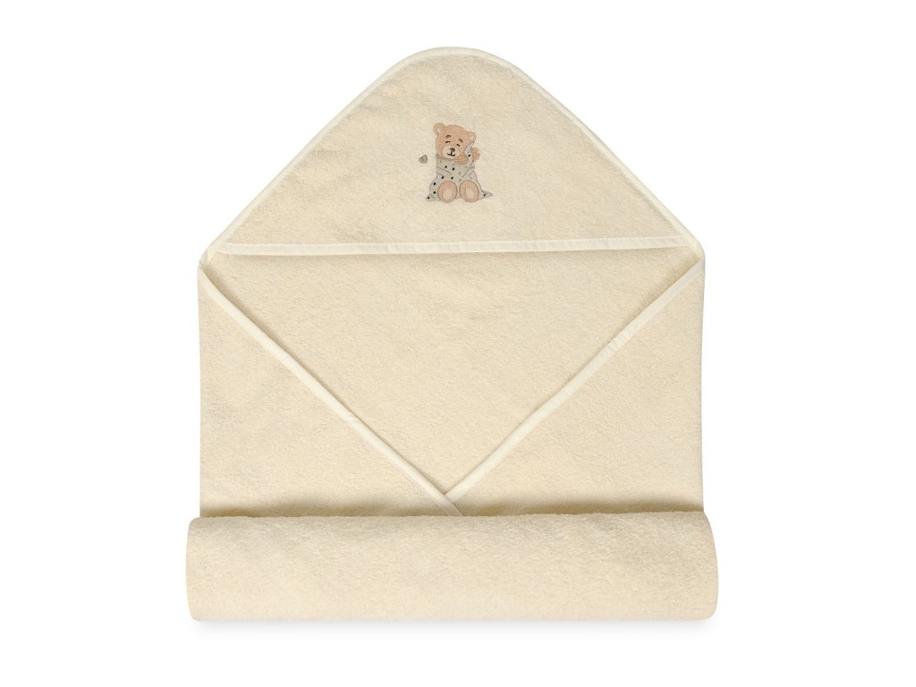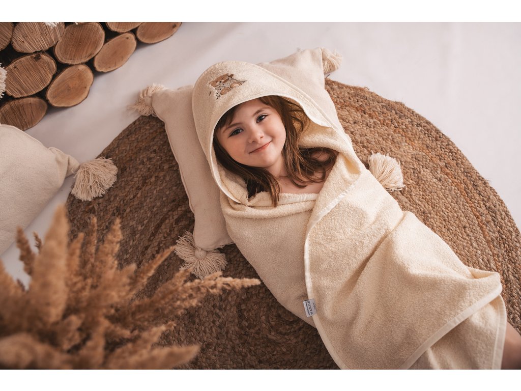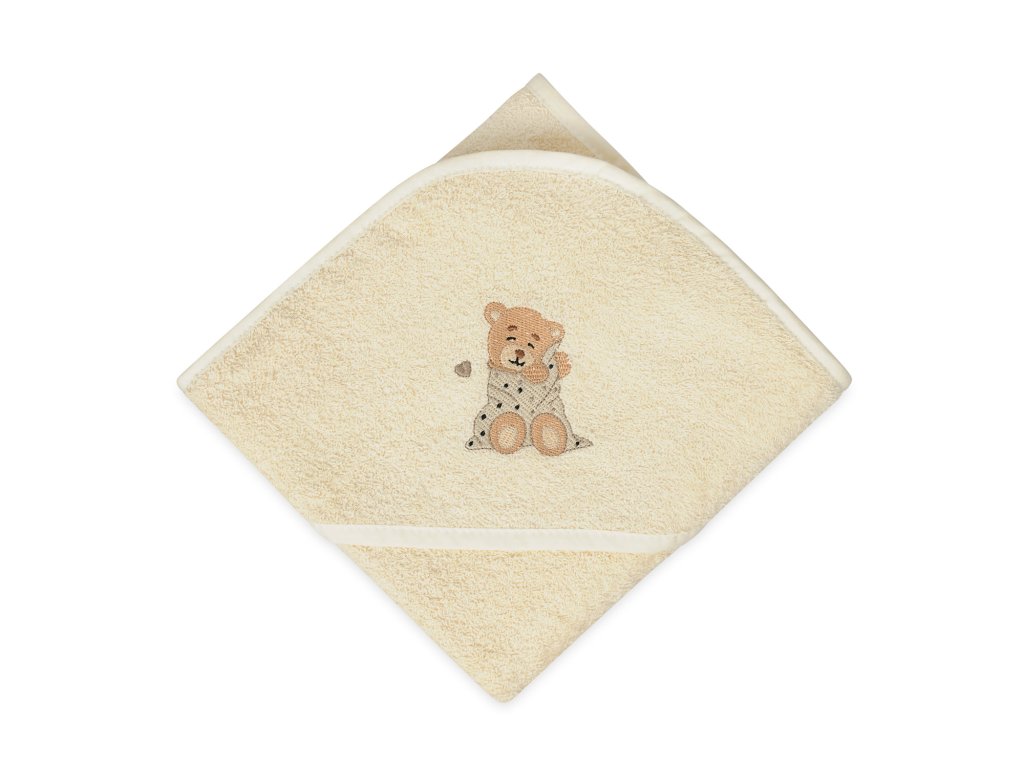 Ez a törölköző puha frottírból készült, amely nagyon kellemes tapintású. A törölköző alkalmas a baba érzékeny bőrére, nagyonjól beszívódik, alaposan kiszárítja a babát, a kapucni pedig védi a baba nedves fejét a megfázástól. Egy kis mackó gyönyörű hímzésével díszítve.