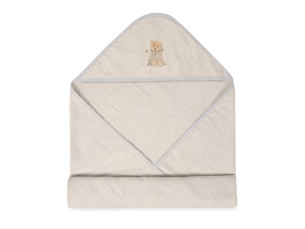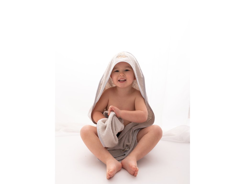 Ez a törölköző puha frottírból készült, amely nagyon kellemes tapintású. A törölköző alkalmas a baba érzékeny bőrére, nagyonjól beszívódik, alaposan kiszárítja a babát, a kapucni pedig védi a baba nedves fejét a megfázástól. Egy kis mackó gyönyörű hímzésével díszítve.