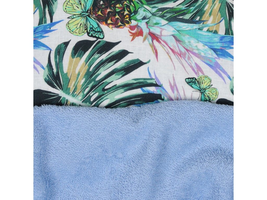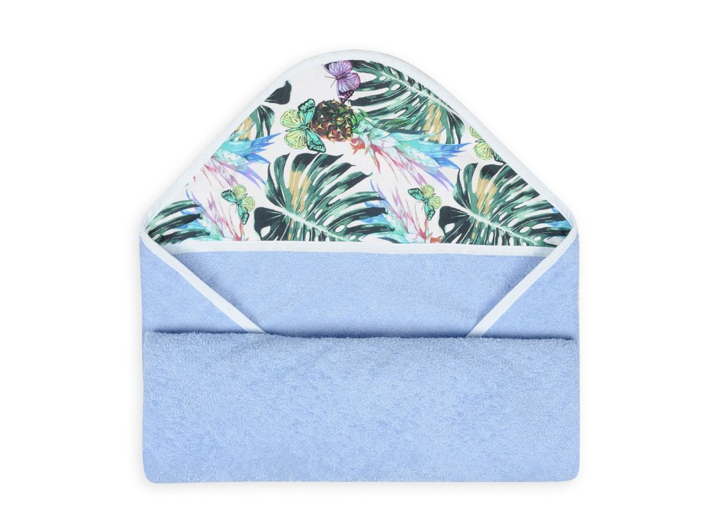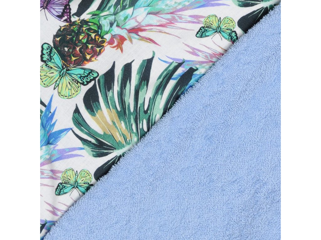 Ez a törölköző puha frottírból készült, amely nagyon kellemes tapintású. A törölköző a gyermek érzékeny bőrének megfelelő, nagyonjól beszívódik, alaposan megszárítja gyermekét, a kapucni pedig megóvja a gyermek nedves fejét a megfázástól. A kapucnit színes virágok díszítik.