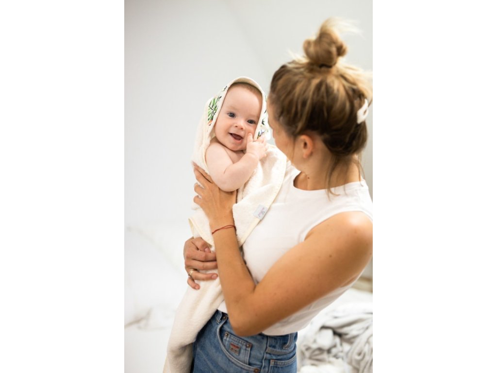 Ez a törölköző puha frottírból készült, amely nagyon kellemes tapintású. A törölköző a gyermek érzékeny bőrének megfelelő, nagyonjól beszívódik, alaposan megszárítja gyermekét, a kapucni pedig megóvja a gyermek nedves fejét a megfázástól. A kapucnit színes virágok díszítik.