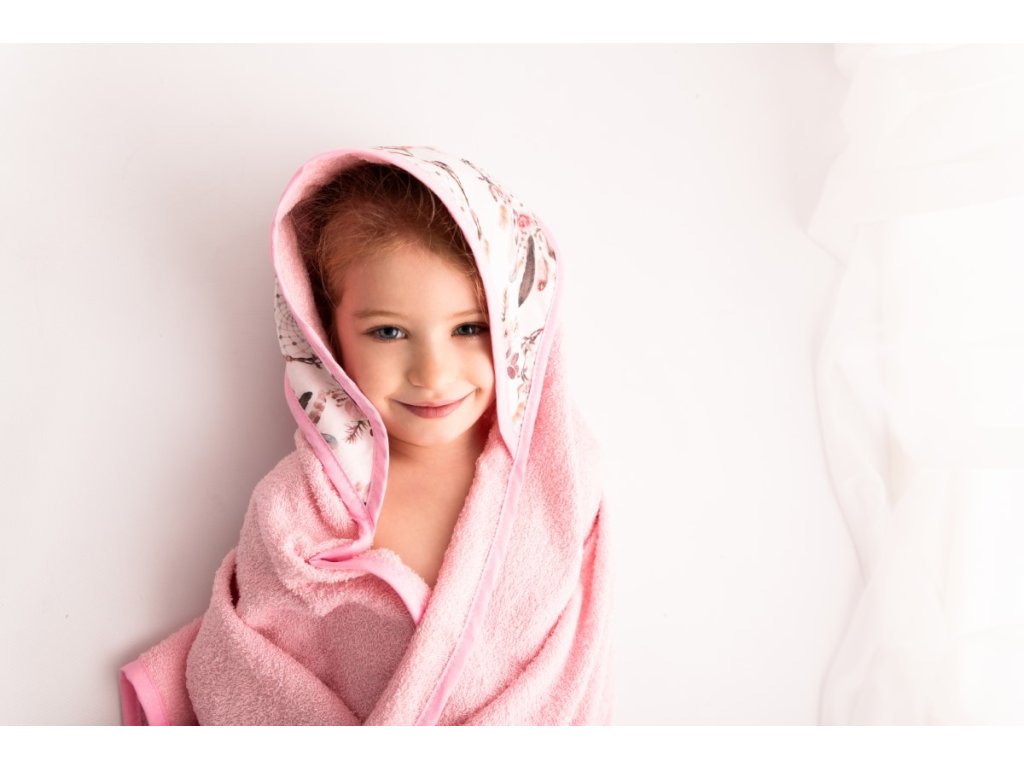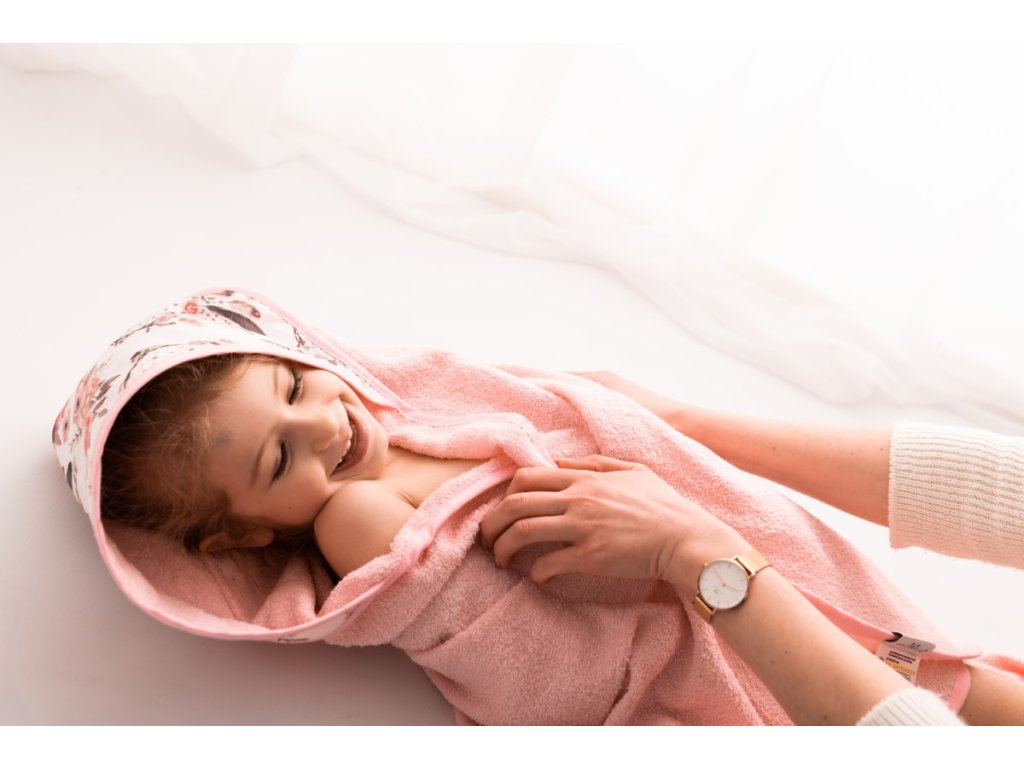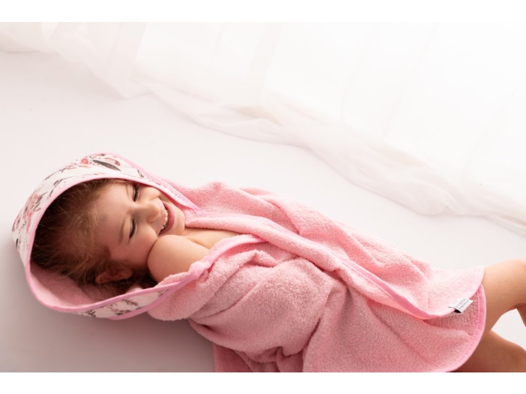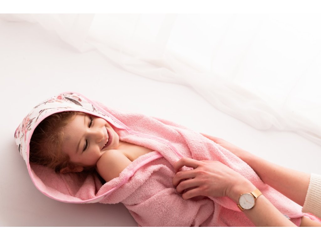 Ez a törölköző puha frottírból készült, amely nagyon kellemes tapintású. A törölköző a gyermek érzékeny bőrének megfelelő, nagyonjól beszívódik, alaposan megszárítja gyermekét, a kapucni pedig megóvja a gyermek nedves fejét a megfázástól. A kapucnit színes virágok díszítik.